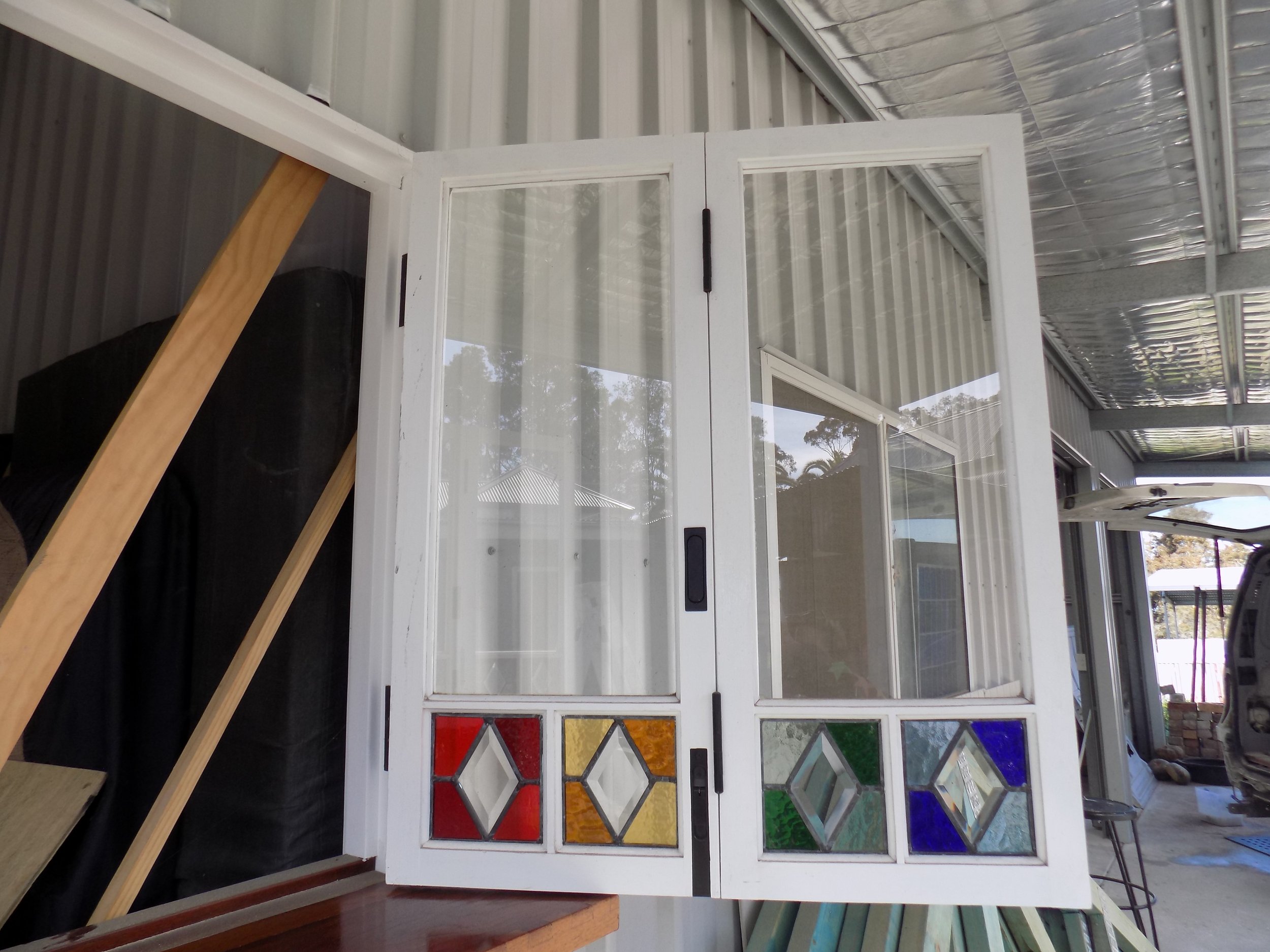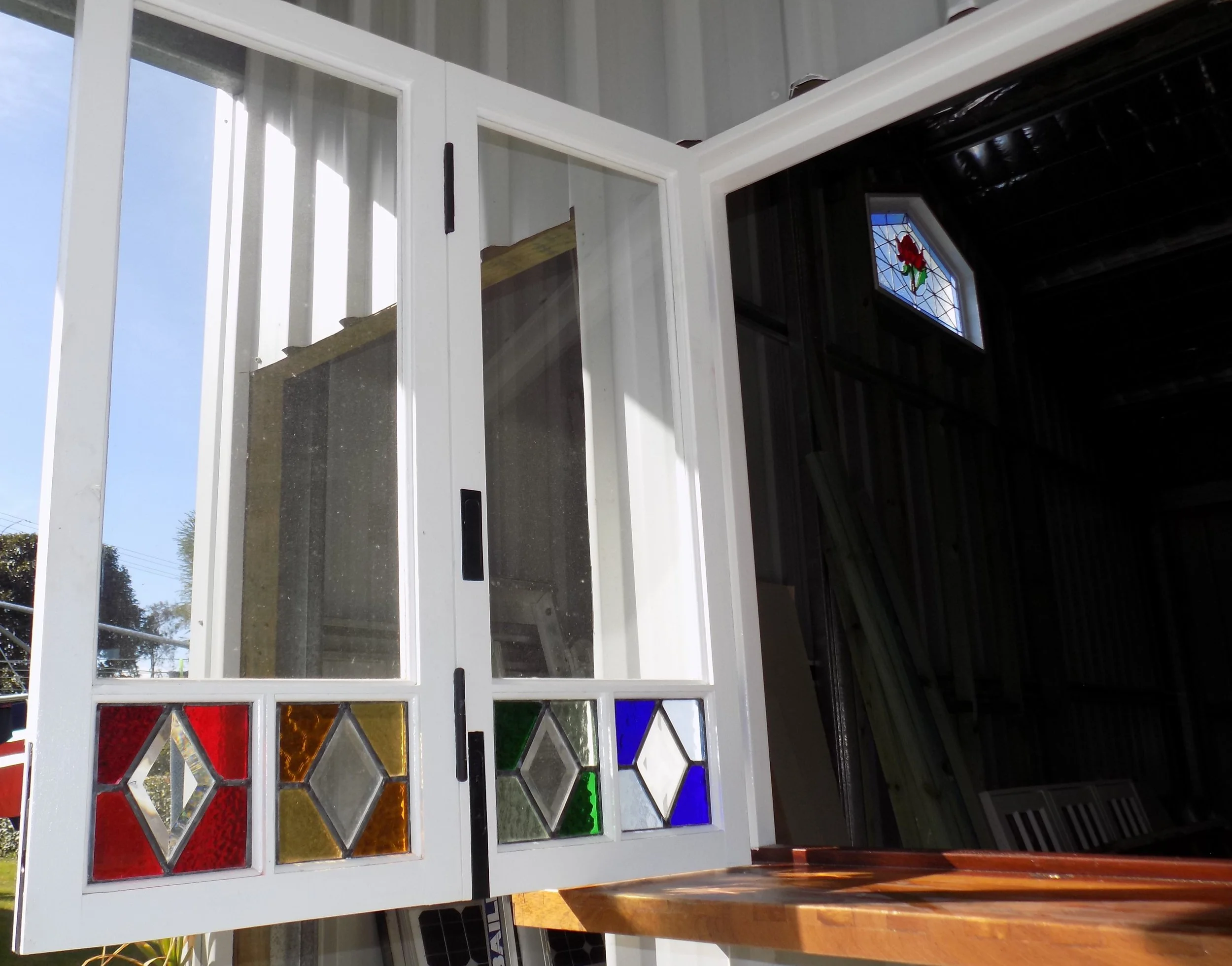 Bi-fold windows featuring multi-coloured glass and bevelled glass diamonds.